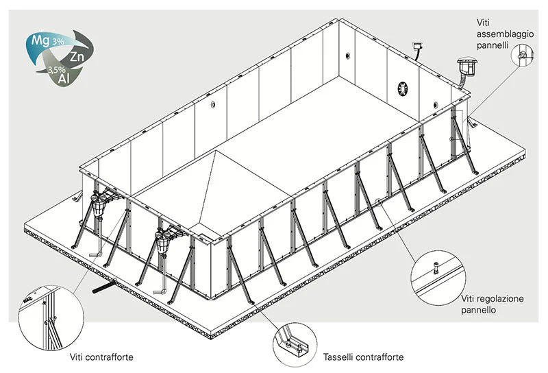 Pannelli in acciaio rivestiti in Magnelis, modulari, senza saldature e con regolazioni per facilitarne la posa. Facili e veloci da installare, permettono la costruzione di piscine con forme regolari o libere, sia a skimmer che con bordo sfioro, interrate o fuoriterra autoportanti e certificate con calcoli strutturali.