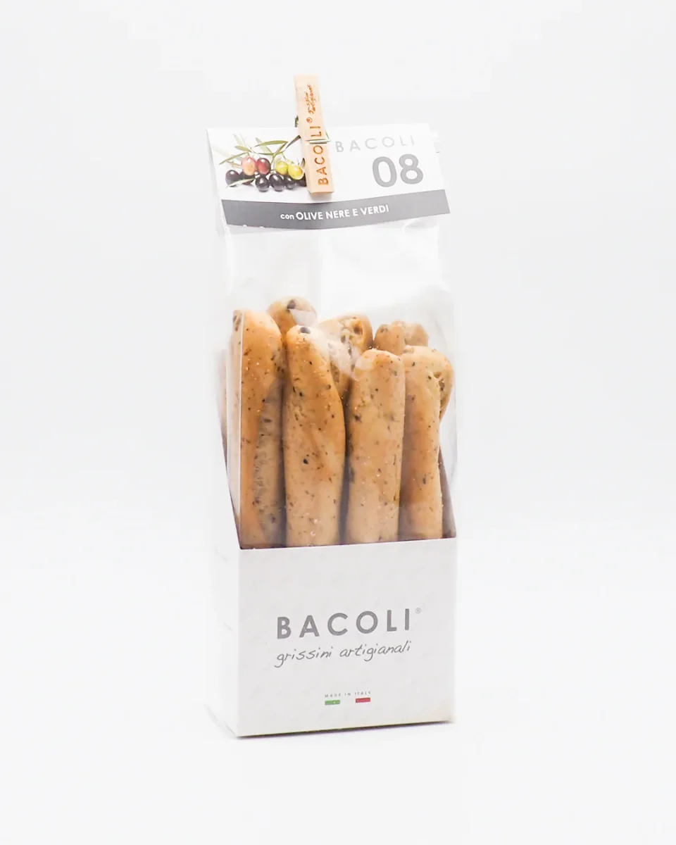 Descrizione: i bacoli sono grissini artigianali firmati Maistrello, senza aromi o conservanti, nel pieno rispetto della tradizione. I bacoli con olive nere e verdi hanno un profumo che ricorda gli uliveti. Grazie al mix di olive, il sapore è particolare e audace. Sono grissini particolarmente croccanti e fragranti, ottimi in accompagnamento a salumi, perfetti per un aperitivo. Affrettati a provarli!
