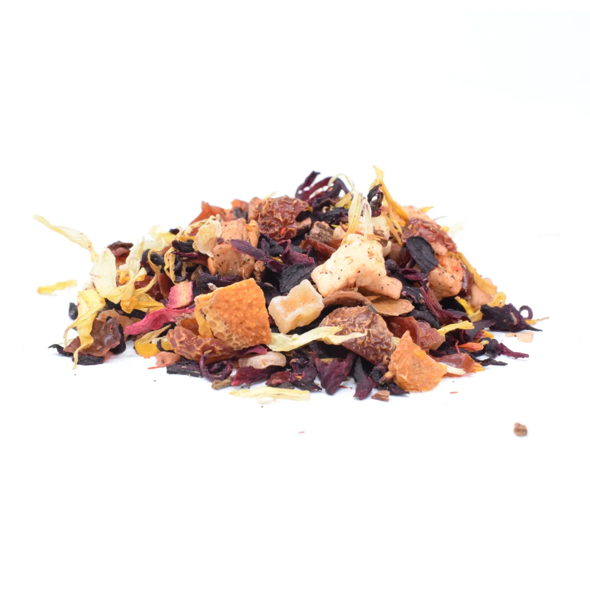 Ingredienti: Ibisco, rosa canina, pezzi di mela, pezzi di papaia candita (papaia, zucchero), cannella, scorze d’arancia, aroma, fiori di calendula, mirtilli, estratto di vaniglia bourbon, cartamo, aroma naturale.