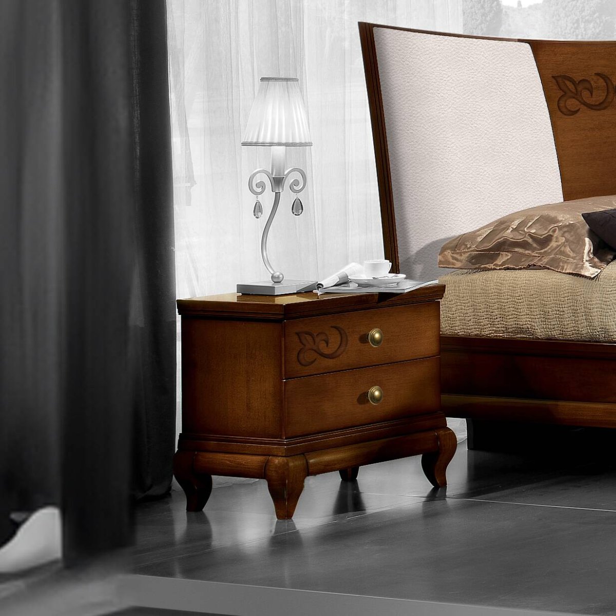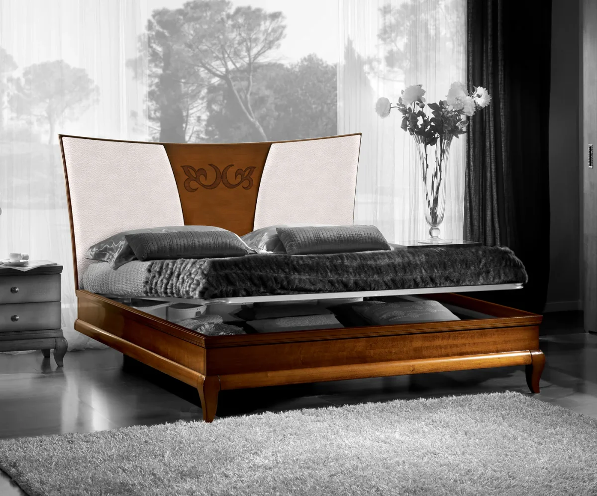 Il legno di ciliegio, caldo e avvolgente, racconta una storia di emozioni autentiche, creando un’atmosfera che trasmette il calore della casa. Ogni curva, ogni dettaglio, riflette l’abilità dei nostri maestri artigiani, che con passione e precisione donano vita a una camera da letto che unisce tradizione e funzionalità.