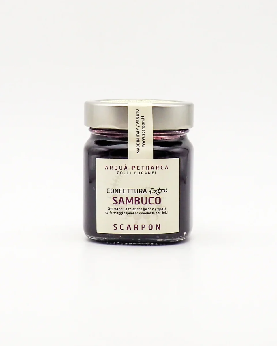 Descrizione: la Confettura Extra di Sambuco dell’Azienda Agricola Scarpon, è prodotta artigianalmente con il Sambuco raccolto nel mese di agosto nel cuore dei Colli Euganei. Prodotta senza coloranti e conservanti, è perfetta in abbinamento a formaggi freschi e di media stagionatura, con carni bianche e cacciagione. Provala anche per rendere più goloso il tuo yogurt bianco naturale.