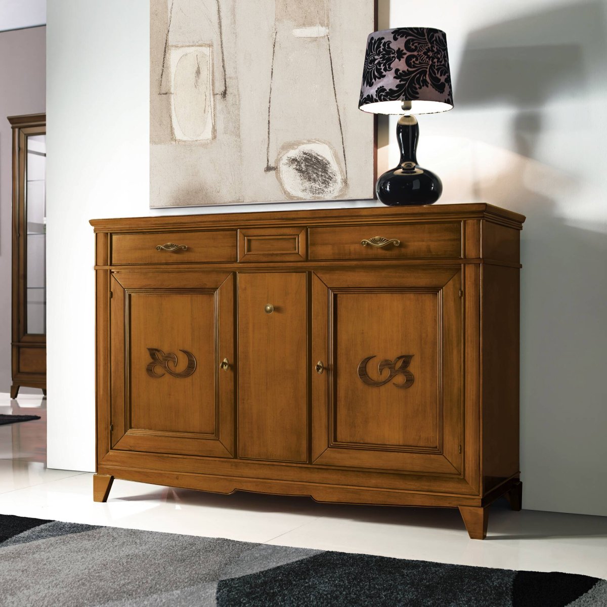 Credenza Piccola Classica Ciliegio due porte tre cassetti Arte D’Este Piombini in, un legno ricco di emozioni, che rievoca il calore della casa. Le forme sono eleganti e accoglienti e le finiture sono preziose ed armoniche. Una «leggerezza resistente» derivante dalla naturalità e robustezza del legno lavorato da sapienti mani artigiane che l’hanno creato nei minimi dettagli.