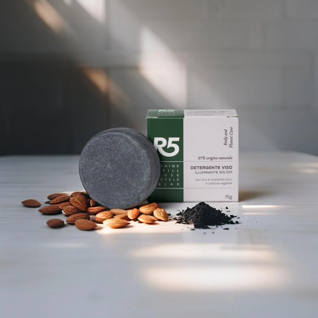 R5 Detergente Viso Illuminante Solido contiene il 97% di ingredienti di origine naturale ed è totalmente privo di siliconi.