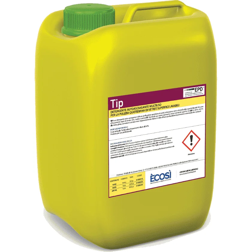 TIP è un detergente per la pulizia ordinaria di arredi, attrezzature, vetri e di tutte le superfici lavabili.