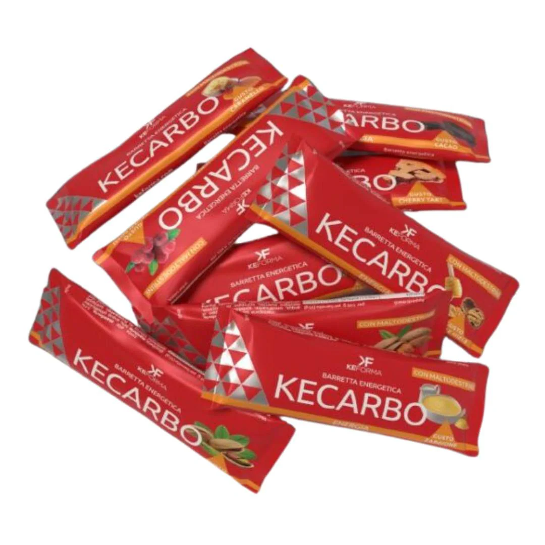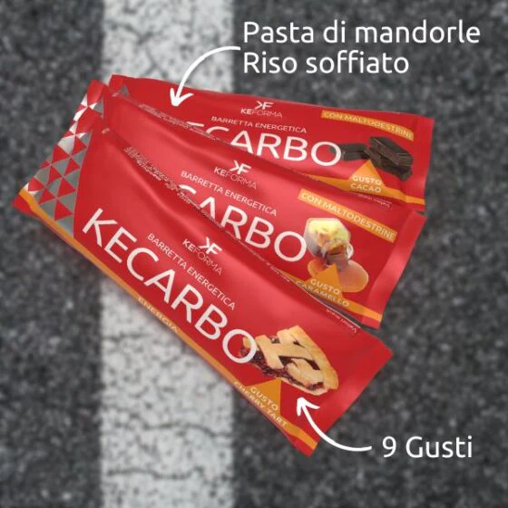 KE CARBO è una barretta a base di pasta di mandorle e riso soffiato, appositamente formulata per aiutare l’atleta nei momenti di fame e calo di energia.