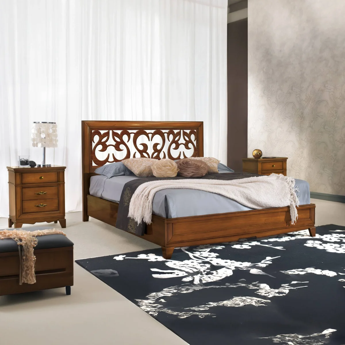 Gli occhi sono grati a questo spettacolo corale: la bellezza e l’esaltazione delle venature, le accoglienti nuance che rievocano il caldo sottobosco dal bruno dorato al rosso e l’ esclusività della lavorazione traforata della testiera dona ricercatezza facendolo sembrare un’opera d’arte.