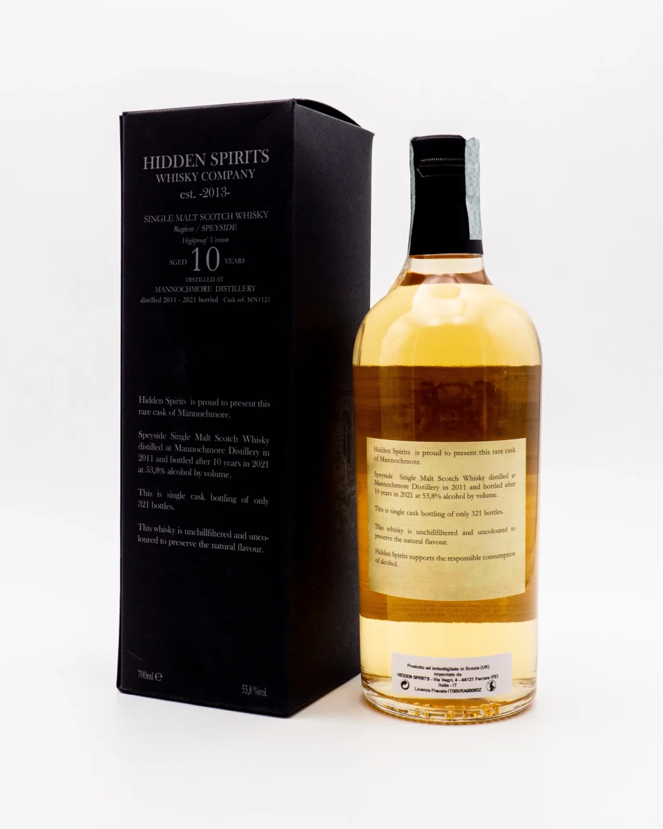 Descrizione: questo Single Malt Scotch Whiskey viene invecchiato per dieci anni in una botte singola di Mannochmore. Imbottigliato successivamente da Hidden Spirits, nel 2021, da una hogshead ex- bourbon. Presenta un colore limpido, con una torbatura assente. Edizione limitata imperdibile di 321 bottiglie.