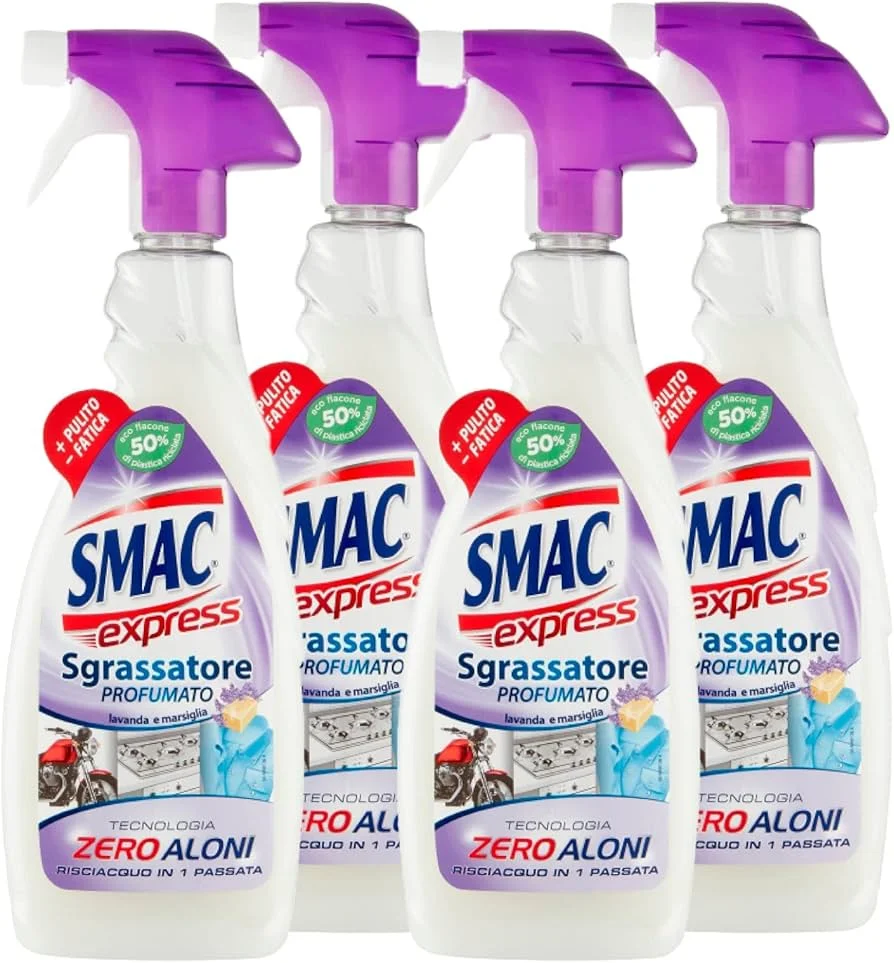SMAC Sgrassatore Profumato elimina rapidamente il grasso e lo sporco da ogni superficie, possiede profumazione alla lavanda e sapone di Marsiglia.