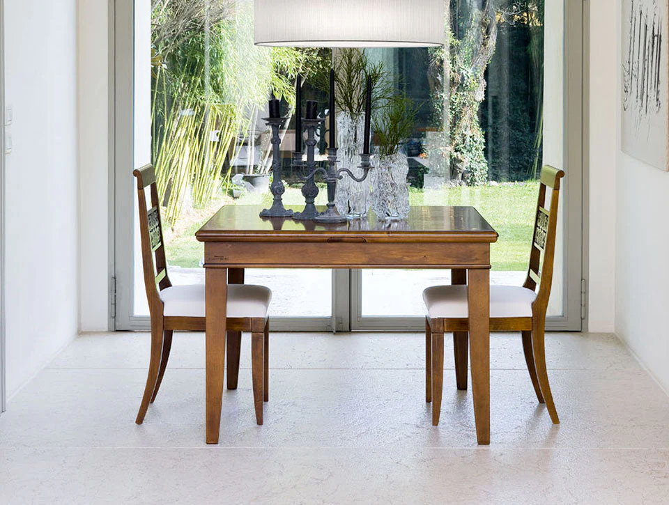 Il tavolo quadrato allungabile è realizzato in legno di ciliegio, un’essenza calda e accogliente che richiama la tradizione dell’arredo classico. Le forme sono eleganti e ben proporzionate, pensate per valorizzare l’ambiente domestico e accompagnare i momenti di convivialità.