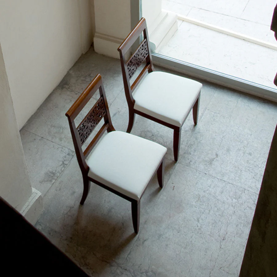 Lo schienale, impreziosito da lavorazioni artigianali, esalta le venature del legno e conferisce alla sedia un carattere distintivo, elegante e senza tempo.