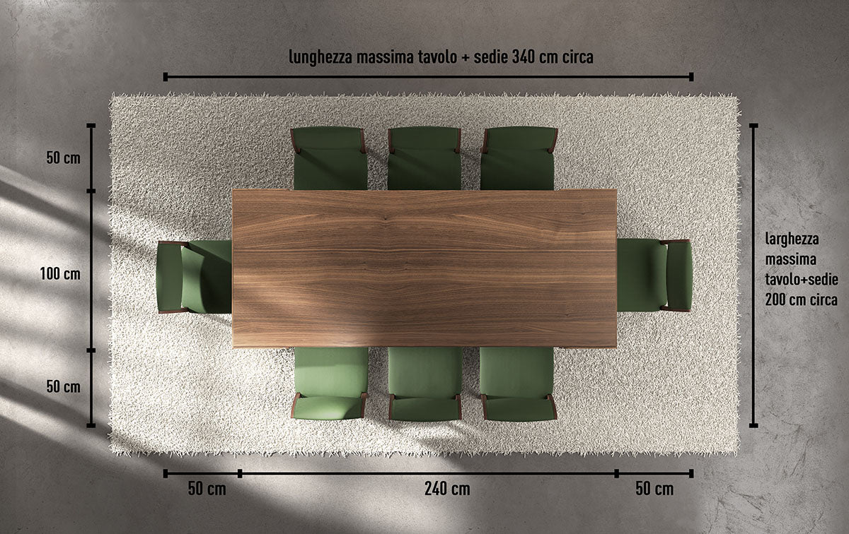 La lunghezza di 240 cm permette di ospitare fino a otto persone con comfort reale, mantenendo proporzioni corrette tra piano, sedute e spazio di movimento. Non è semplicemente una versione più lunga: è un tavolo progettato per avere presenza, stabilità e autorevolezza visiva.