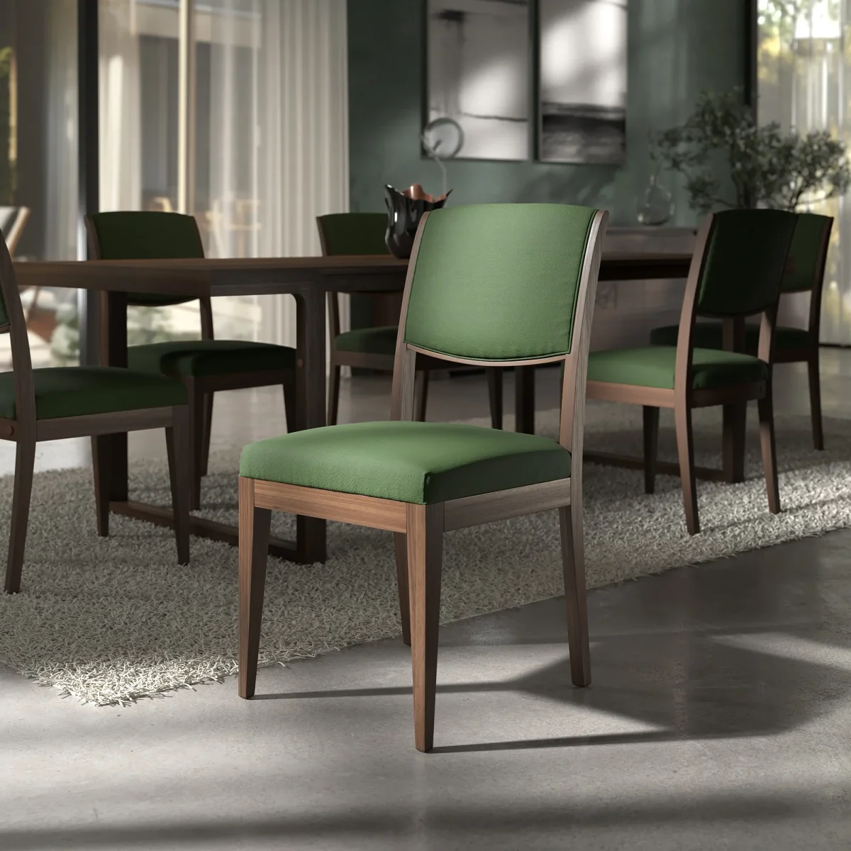 Il tavolo rettangolare 240 × 100 cm, con altezza 76 cm, è pensato per ambienti strutturati dove la zona pranzo diventa elemento architettonico centrale.