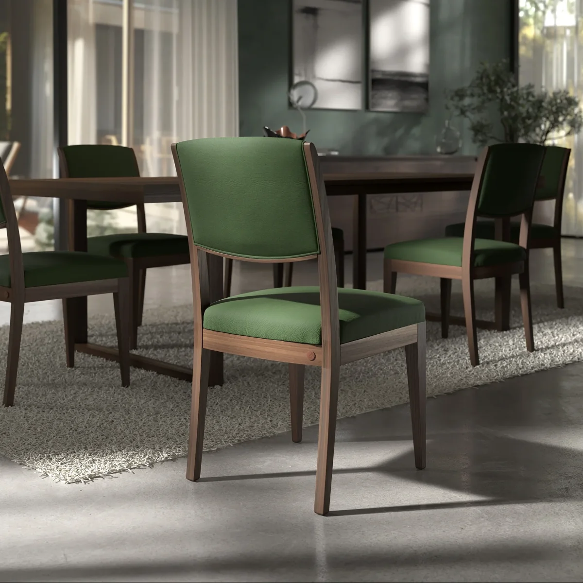 Le sedie sono disponibili in 9 varianti colore di vera pelle, selezionate per garantire continuità cromatica con le finiture del legno e versatilità progettuale.
