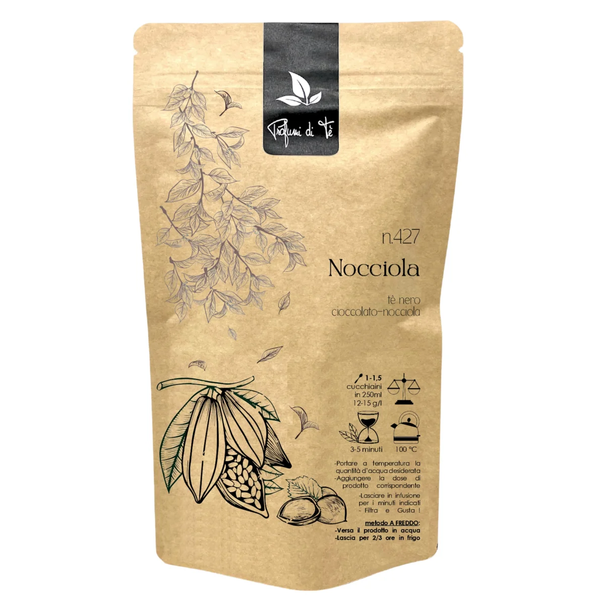 Ingredienti: Tè nero, croccante (nocciola, zucchero), bucce di cacao, fave di cacao, aroma.